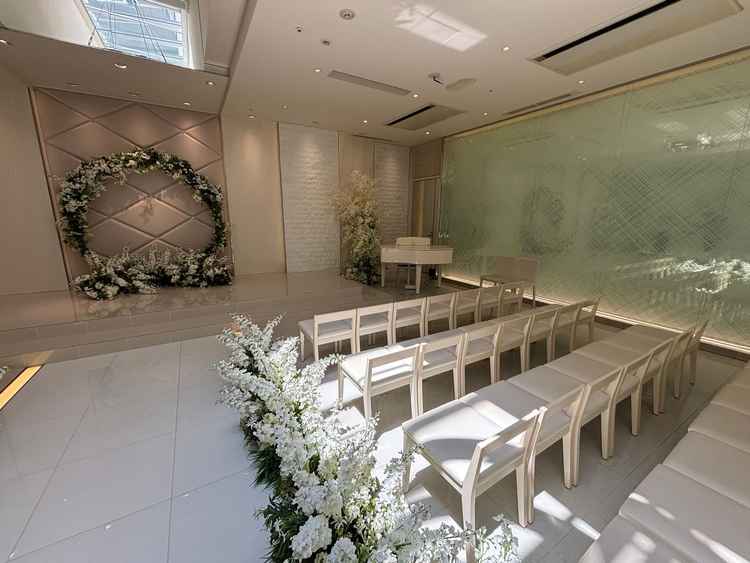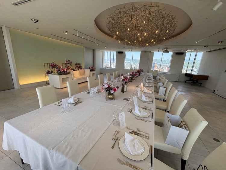 最上階の披露宴会場は景色が素晴らしく、会場の広さも少人数挙式にピッタリでとても良いと思った。 チャペルは少し窮屈感を感じてしまった。 また天井からの自然光が入るのは良いと思ったが、そこから見える景色に汚い建物が見えたのが気になった。