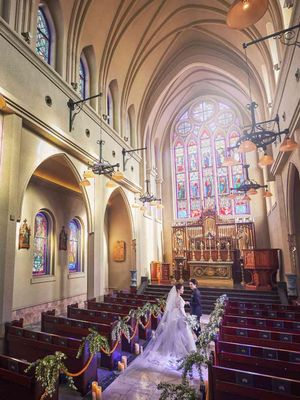 山口県で随一の広さを持つ独立型大聖堂。 360度に配置されたステンドグラスから入る光がバージンロード、ドレスを照らす姿は圧巻。