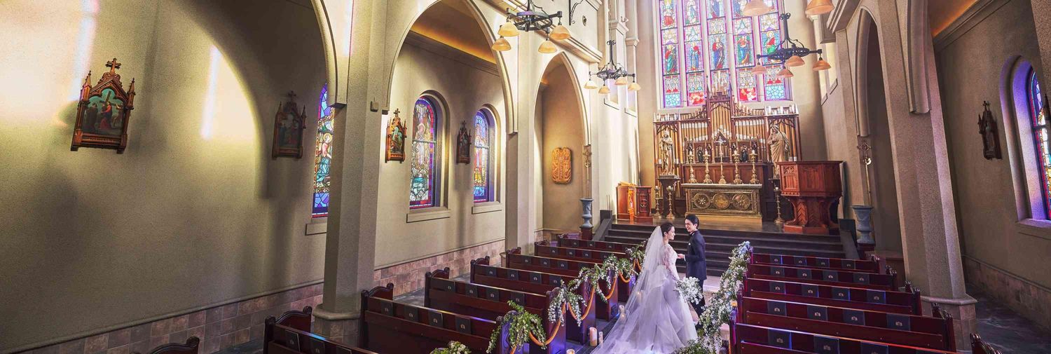 花と彫刻の町に佇む大聖堂は100年以上の時を経た特別なステンドグラスに囲まれた特別な場所。360度から降り注ぐ祝福の光に満ちた幻想的な空間が永遠の愛を約束します。