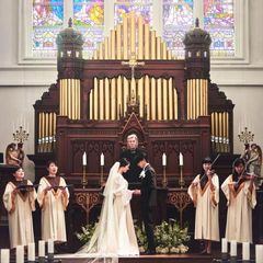 模擬挙式 緑と水に包まれる大聖堂で憧れの花嫁に。180年以上の歴史を刻んだステンドグラスに360℃囲まれ、差し込む自然光が優しくおふたりとゲストを包みます。美しく響く生演奏が一層、挙式を華やかに、厳かに彩ります