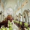 模擬挙式 緑と水に包まれる大聖堂で憧れの花嫁に。180年以上の歴史を刻んだステンドグラスに360℃囲まれ、差し込む自然光が優しくおふたりとゲストを包みます。美しく響く生演奏が一層、挙式を華やかに、厳かに彩ります