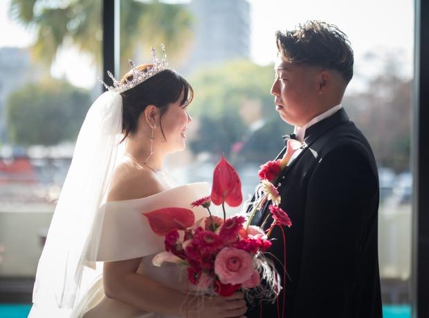 ご披露宴会場は1日で一番過ごす時間が長く、たくさんのお写真が残ることを踏まえて、とにかくご披露宴会場の装飾をこだわったおふたり。指名フラワーコーディネーターからの提案も踏まえて、ご新婦様のお好きな赤、ピンク、水色を中心とした個性溢れる海外チックでポップな装飾に仕上がりました。おふたりらしさ全開の唯一無二の会場になりました。