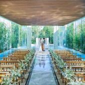 三面ガラス張りの開放感あふれるチャペル。光と水が心地よい自然あふれる空間で大切なゲストと特別な時間をお過ごしください。