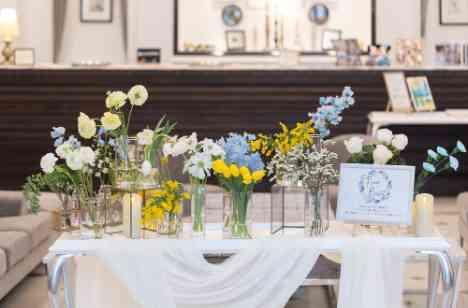 お二人がゲストと一緒に楽しめる何か演出がしたいとのことで、お花のお打ち合わせの際にフラワーコーディネーターからのご提案でフラワービュッフェをご案内させていただきました。ゲストには1人1本好きなお花を取って頂き、自分の座るテーブルの花瓶に生けていただき、ゲストにそれぞれ自分のテーブルを飾って頂きました。