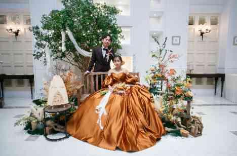 テーマは「Laule'a」ラウレアです。楽しい喜びを木の葉が包む日として、関わってくれた大切な人へ感謝を伝える一日を意味しています。自然由来のおふたりのお名前から、真心を込めて木の葉に包むこと。その葉が集まっておふたりだけの木になり。楽しい幸せを表現しました。お2人のテーマを装飾や、ゲストに感謝を伝えることで表現しました。