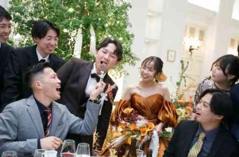 来てくれるゲストの皆様と一緒に楽しみたいと歓談時間を大切にしました。全員としっかりお話をしてゲストにも喜んでもらい、楽しんでもらえるように新郎新婦が自由に歩き回ってゲストの方と乾杯したり、写真を撮ったり、思い出を共に増やしました。幼馴染のご友人様からは新郎様にお料理を食べさせてあげて笑いが起きるような暖かな空間となり、関わってくれた大切な方1人1人へ感謝を直接伝えるお時間となりました。