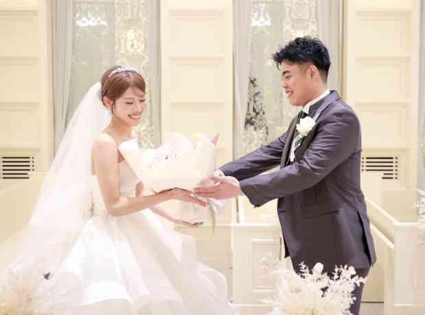 ご披露宴は楽しくワイワイ過ごしたいとお話しされていたお2人ですが、挙式は感動的に。 特に今まで育ててもらった感謝を伝えられるような時間にさせていただきました。 ご新婦様のご入場前には、天の声でご両親に向けてのお手紙を読んでいただきました。 またお2人の大切なお子様にもご登場をいただき、挙式はとても温かな雰囲気で行われました。