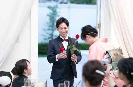 12本のバラはそれぞれ感謝・誠実・幸福・信頼・希望・愛情・情熱・真実・尊敬・栄光・努力・永遠という言葉を象徴しています。ダーズンローズを花嫁に贈ることは「12のことすべてをあなたに誓います」という意味を持っています。ご新郎様からご新婦様へ渡った瞬間ゲストの皆様から拍手が起こりました。