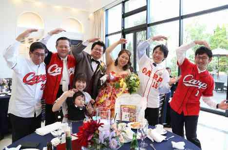お色直し入場時はダンスを踊りたいと当初からおっしゃっておりました。サプライズでガーデンから登場し曲のサビの部分からダンス♪とっても盛り上がりました。 またお二人ともカープが大好き!カープ仲間の皆様はユニフォームを持参!お召しいただき空間をより明るくしてくださいました。