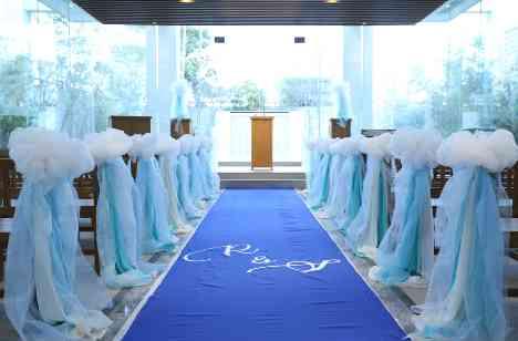 こちらもご新婦様こだわり! チャペルもオリジナリティを出したいということで、フラワーコーディネーターが提案したのはお二人のイニシャル入りのアイルランナー♪ 少し装飾を加えるだけで特別な空間になりました。