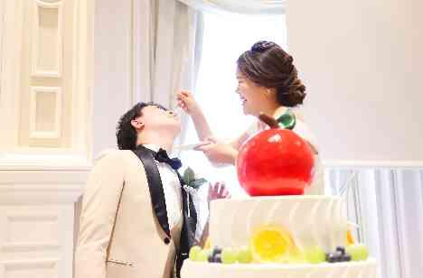 新婦様の好きな果物はリンゴなのだとか♡大好きなリンゴをウェディングケーキに活かしたい!というお気持ちを頂き、新郎新婦様の前にご用意されたのは大きな大きなリンゴの飾られたケーキが登場!会場もまさかの大きさに大盛り上がり♪大好きなリンゴのケーキを前に新ろう新婦様のファーストバイトのご披露です!ゲスト一体となって「あーん!!!」大きなお口を開けて幸せの分だけケーキをバイトしていらっしゃいました♡