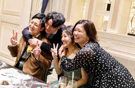 新郎新婦様の大好きなご友人たちと、沢山のお写真タイムをご用意いたしました。このご時世だからこそ、なかなか会うことが叶わなかったご友人も多数いらっしゃったのだとか。。。久々に会う顔ぶれに、新郎新婦様の表情も安堵と楽しさで笑顔いっぱいのお時間となりました。当館のパーティー会場はダイヤモンド型。ゲストとの距離感も近いからこそ、声をかけやすいお作りでございます♪