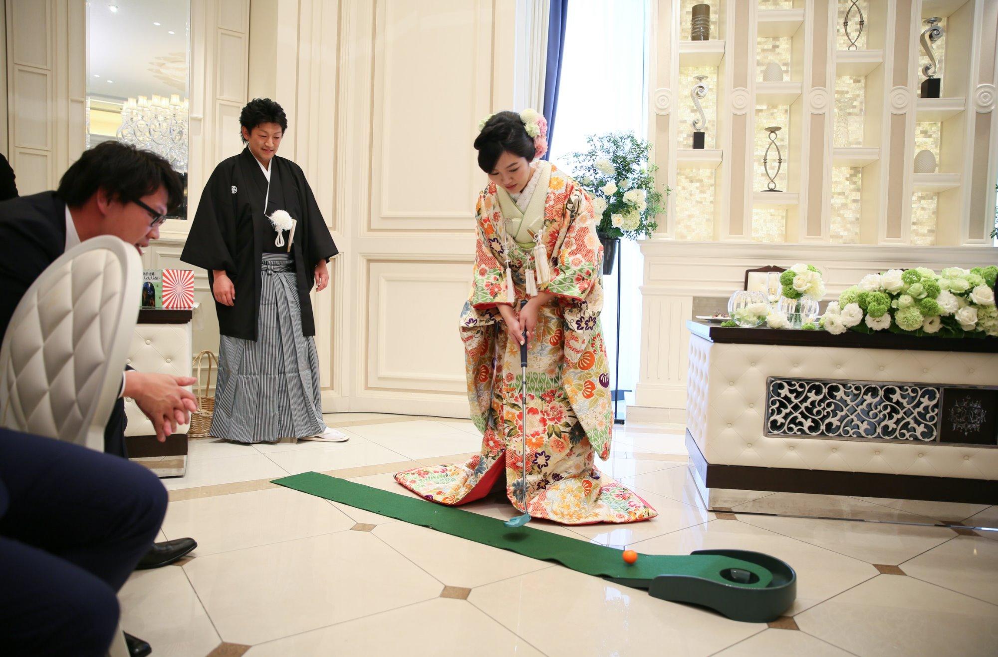 おふたりのキューピットになって下さったゲスト様へのBIGスプーンでのサンクスバイトや、お色直し後のおふたりがパターしたゴルフボールがカップインするかどうかをゲストに投票していただくイベント等、参加する全員が一緒にワクワク笑顔になるようなシーンをたくさん取り入れた一日にしました♪ゲストからの祝福のおかげでおふたり揃ってナイスイン☆「おふたりともカップインする!」と投票した方へは豪華プレゼントを贈呈!