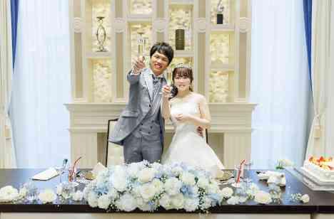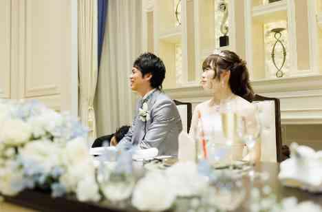 ゲストの皆様とのお時間を大切にされたいという想いから、進行を極力シンプルにして、歓談やお写真の時間をたっぷりともうけたいというのが、おふたりのご希望。大切な方々からの祝辞やメッセージをうけ、とても嬉しそうな表情を浮かべていらっしゃる様子が印象的でした。会場のアレンジは「ロイヤルブリティッシュ」の基調色のブルーとも相性のよい、上品なホワイトや淡いブルーでまとめました。