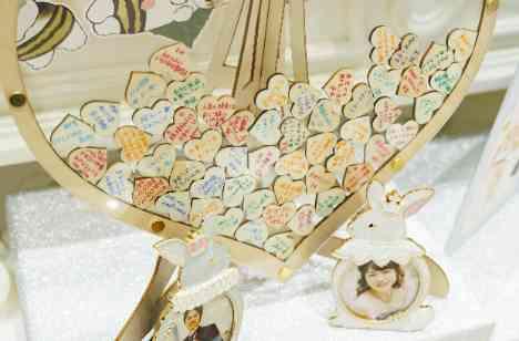 受付では、ゲストの皆様におふたりへのお祝いのメッセージをハート型のピースに書いていただき、大きなハート形のボードにいれていただく【ウェルカムドロップ】を採用。手描きのメッセージの温かみと、おふたりへの想いが込められた温かい演出。おふたりも、披露宴の入場前に嬉しそうにメッセージをご覧になっていらっしゃいました。