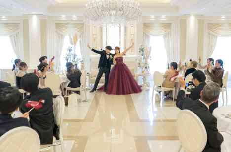 一番の目玉再入場では、カラードレスのお色当てクイズ! おふたりのこだわりでゲストにはペンライトではなくリボンワンズを振っていただきました。手作りのリボンワンズには鈴もついていたため、きれいな音が響き渡りました。拍手とともに高砂へ。 その後、お二人からのサプライズダンスにゲストも大盛り上がり♪ ダンス後会場は沢山の拍手に包みこまれました。