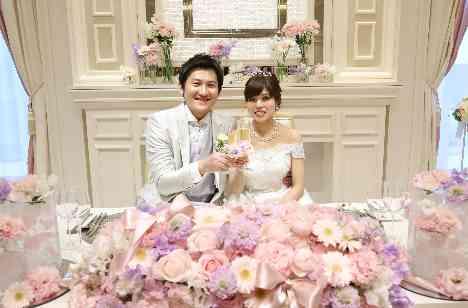 ピンク×パープルのお花やリボンで可愛らしく彩られた会場は専属フローリストと打ち合わせしてオーダーメイド。メディアでも話題の併設レストランを手掛けるシェフ特製のコースや、新郎様の出身地の名物をあしらい個性を出したケーキなどは、ゲストの皆様からも好評でした!披露宴のラストは、新郎様から新婦様に花束を贈るサプライズもあり、感動に包まれるシーンで無事結びました。