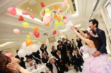 再入場はドレス&タキシードの色当てクイズの正解発表!お二人が登場した瞬間、大きな歓声に包まれました。各テーブルでは幻想的な光の演出や、フォトジェニックな巨大バルーンのスパーク演出などをし、ゲストも大盛り上がり♪弾けた風船から舞い上がったハートバルーンはゲストがキャッチし、フォトラウンドの際にも大活躍でした♡
