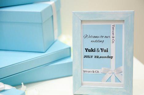 美男美女でお洒落なお二人が選んだのは、婚約指輪で贈られたティファニーをモチーフにしたコーディネート!ティファニーブルーのリボンと、カラードレスの色味に合わせた装花を品よくMIXした大人可愛い雰囲気に♪会場装飾のお打ち合わせでは、専属フローリストへお二人から積極的にイメージをお伝えいただくことで、細部までこだわり抜いたコーディネートが完成しました♡