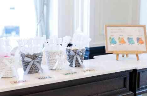 ドレスとタキシードの組み合わせクイズとして4色のペンライトを用意したおふたり♪受付時に4パターンの組み合わせから正解だと思うペンライトをお選びいただき、お色直しの入場シーンでゲストに振っていただくと、暗い会場内で色鮮やかなペンライトが映え、とても綺麗です!華やかなブルーのドレスとカーキのタキシードに身を包んだおふたりの登場に歓声が上がりました。