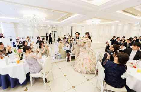お二人のお色直しのご準備が整い、いよいよ再入場☆ するとご新郎様の手にはマイクが・・・!そしてご入場のタイミングでご新郎様の素敵な歌声が流れてきました!!お色直しされたお二人の姿とご新郎様の歌声で会場からも歓声があがります♪ お二人が皆様のために考えられた素敵な演出で、大盛り上がりとなった再入場でした。
