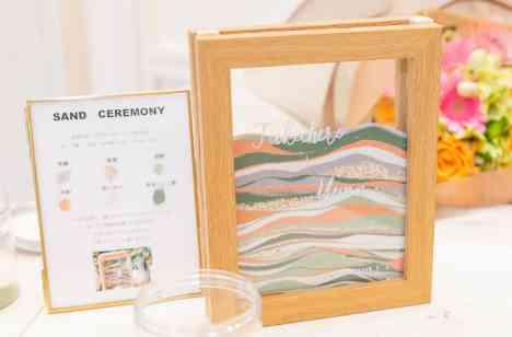 ゲストの皆様に永遠の愛を誓う『人前式』を選ばれたおふたり。承認のセレモニーは、ゲストの皆様にご参加頂く『サンドセレモニー』をご用意♪「ふたりの結婚生活に大切なこと」として用意された【笑顔・愛情・感謝・忍耐・思いやり・美味しいご飯】6つの意味を持つカラフルな砂。ゲストの皆様とおふたりがそれぞれ想いをこめて選んだ砂が注ぎ込まれて、世界にひとつだけのメモリアルオブジェが完成しました!