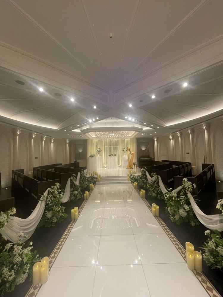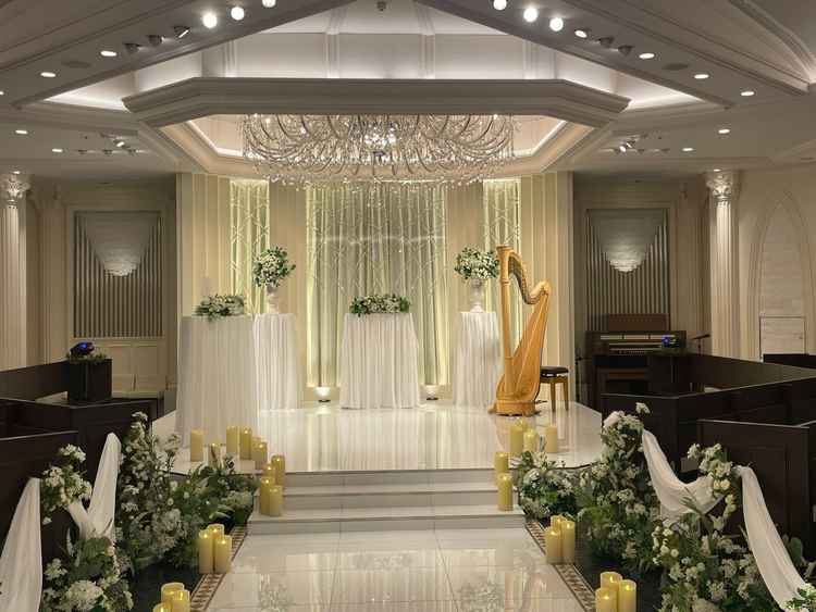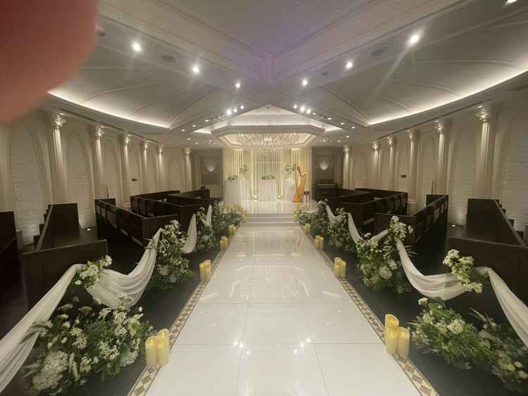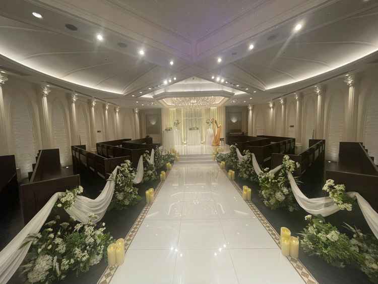 チャペルが対面式ドレスが綺麗に見えるように考えられた造りになっていた。 バージンロードが短いところが、私達には合っていると感じた。