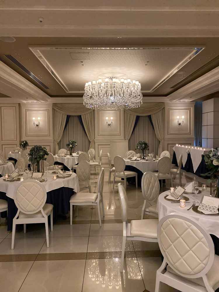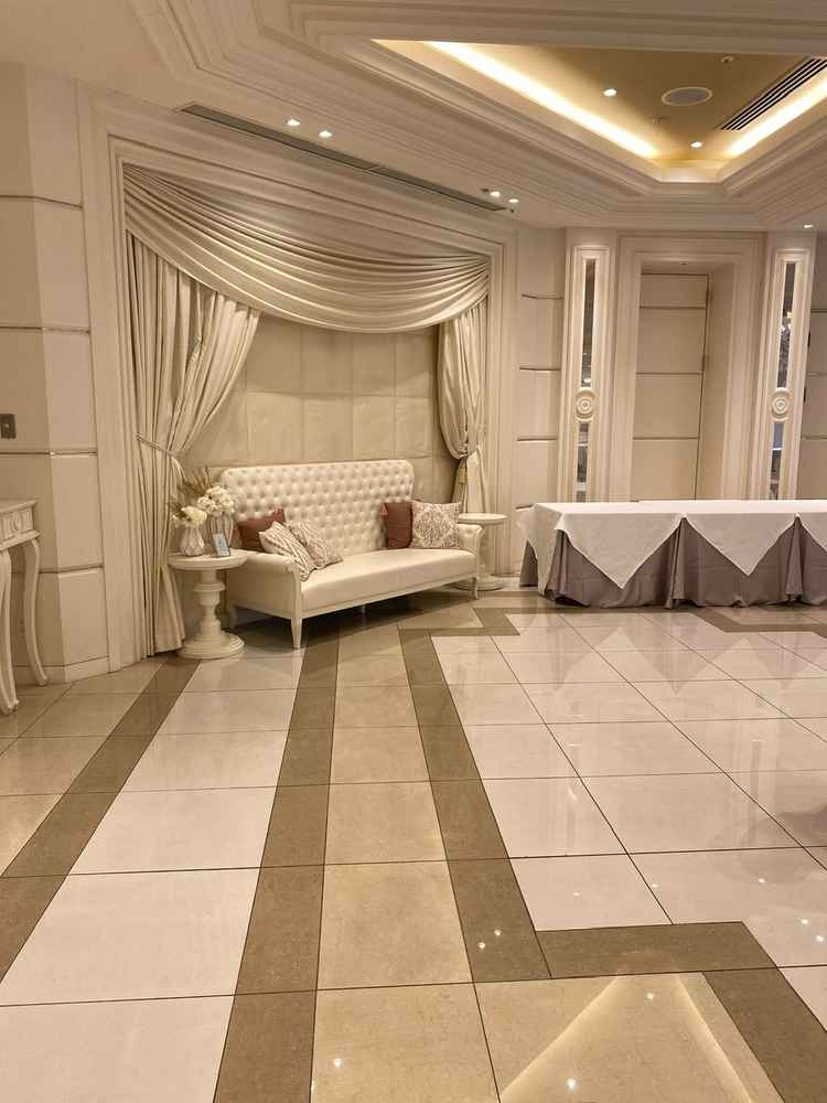 披露宴会場は広めで白基調なので、席数が少ないと装飾によってはシンプルになると感じました。会場全体も白で統一されています。