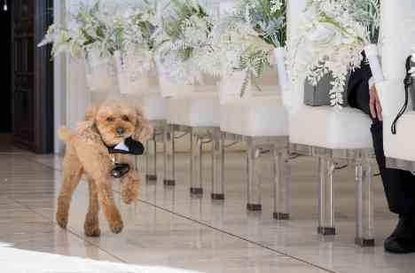いよいよ挙式本番!2匹とも上手にリングを届けてくれるのか?ゲスト全員が見守る中、扉がオープンしました。 ゲストの皆様が見守る中、扉が開いた瞬間2匹は迷うことなくお二人のもとに!上手にリングを届けることができました。 見事、正解したゲストの方には披露宴中にお二人からプレゼントをお渡しいただきました。