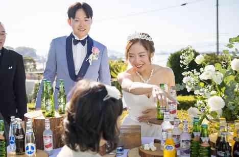 ゲストの皆様と一緒に、海ロケーションのガーデンで乾杯! 堅苦しい雰囲気ではなく、ゲストの皆様にはとにかくラフにリラックスしてお楽しみいただきたいお二人は、会話を楽しみながら、お一人お一人にボトルドリンクを直接お渡しされました。 自然光たっぷりのガーデンでプールを囲みながら温かい時間を過ごされました。