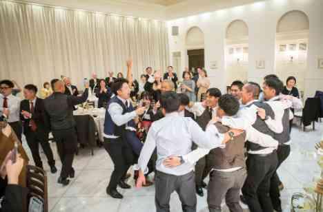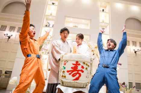 お色直しはカラードレスではなく、和装だったお二人。お衣裳に合わせてケーキ入刀ではなく鏡開きをご希望されました。スタッフから菰樽を運ぶのではなく、大切なご友人様にお持ちいただき、場を一緒に盛り上げて頂きました。同じ消防士仲間の二人がお二人の元まで運んできてくださり、最後までしっかりと盛り上げてくださいました。ゲストの方もお酒が好きな方が多かったため、お二人からお酒のふるまいをいたしました。
