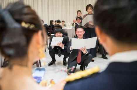 みんなで一緒に盛り上がることが出来るというところが魅力的テーブル対抗似顔絵リレー。ゲストの皆様のテーブルに色紙とペンを配りそれぞれテーブルのみんなで協力をしながら1枚の絵を完成させます。ゲストの皆様は色紙をもってお二人の近くに行きながら、楽しそうにお二人の似顔絵を描いていました。それを見て新郎新婦様もお二人目線で動画を撮影したりしながら楽しんでいらっしゃいました。