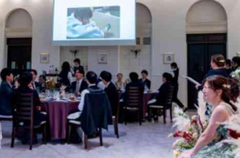披露宴はもう一つの会場ヴィクトリアハウスをお選び頂きました。挙式時の雰囲気とは別のとにかくロケーションが素敵な会場となっております。この空間で行ったのは新郎新婦様クイズ。中身は沢山お二人の事を知っていただく内容になっておりまして、中にはプロポーズの際の動画も。みんなが見たことないシーンで会場は大盛り上がりしていました!