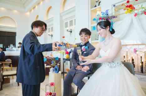 新郎様の大学時代のアルバイト先でもあるベイサイド迎賓館。新郎様だけではなく、当時のアルバイト仲間も思い出が詰まっている会場で、ゲストとして楽しんでほしいという想いがありました。 ゲストに新郎新婦の乾杯酒を注いでいただいたり、先導をしていただいたり当時のことも思い出していただきながら楽しんでいただく演出を考えました。 見ているゲストも盛り上がってくださり、親御様も嬉しそうな表情をされていました。