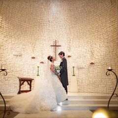 【チャペル"BIANCA PICCOLINA"の見学】白レンガのあたたかみとキャンドルの優しい灯りがおふたりとゲストを包み込みます。大きすぎないチャペルでアットホームな時間を彩ります。
