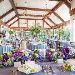 天井のステンドグラスと四方の窓から、やわらかな自然光が差し込み、緑やガーデンが望める心地の良い空間。テーマ毎のコーデによる雰囲気の違いや高砂からの目線やゲスト目線など体験して披露宴気分を味わって♪