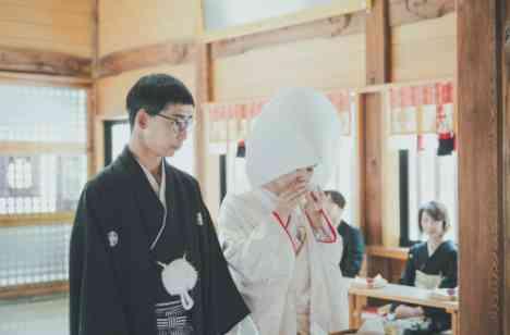 警固神社の厳かで静寂な雰囲気で挙げる神前式。 参進の儀には過去を”ご親族様”、 現在を”新郎新婦様”、 未来を”拝殿”と表しており、今まで支えてくださった方々と想い出を振り返り、そして感謝の想いを噛みしめながら一歩一歩未来に向かって歩むという意味があります。おふたりのご家族様への想いが伝わる神前式となりました。