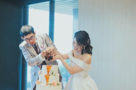 入場後はおふたりのこだわりの演出でもあった 皆様の目の前でソースをかけ、ウエディングケーキを完成させるカラードリップケーキを行い、「今から何が始まるの?」とワクワクするオリジナリティ溢れる演出を行いました。ご家族様のみのご結婚式でしたがおふたりらしい演出を行うことであたたかく、アットホームな雰囲気に包まれる時間となりました。