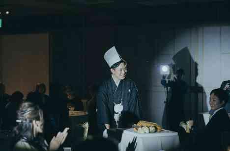 お色直しにむかわれた新郎様がコック帽を被って登場! 通常のお料理パフォーマンスでは料理人が登場し、お料理を皆様にお披露目しますが、新郎様のサプライズ登場により会場内は笑いと驚きで和やかな雰囲気となりました。ゲストの皆様はお料理の匂いにそそられ、よりお料理を楽しみながら召し上がることができました。