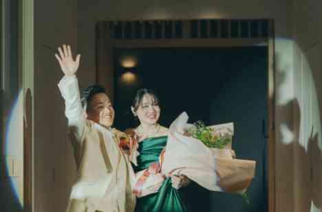 披露宴の結びには、新郎様から新婦様へサプライズムービーの贈り物。これまでの思い出や感謝の想いが映し出されるたび、会場はあたたかな空気に包まれました。そして、ご両親へ花束を贈呈。大切に育ててくれた感謝の気持ちを言葉とともに届ける、心に残るひとときとなりました。ゲストの皆さまに見守られながら、ご両家の絆とおふたりの想いが重なる、感動の結びとなりました。