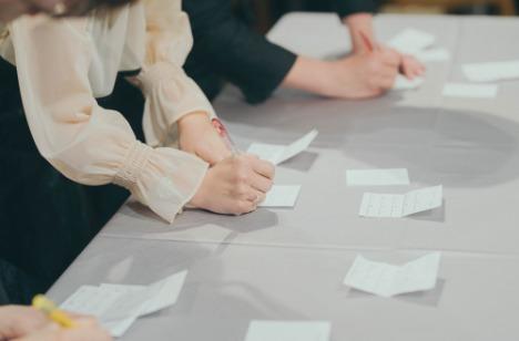 ご披露宴では、ゲスト全員で楽しめるクイズ大会の演出を取り入れました。おふたりにまつわる思い出やエピソードをもとにした問題に、会場は笑顔と歓声に包まれます。テーブルごとに相談しながら答えを導き出す時間は、自然と会話も弾み、ゲスト同士の距離もぐっと近づくひとときに。おふたりらしい温かな雰囲気の中、会場全体がひとつになって盛り上がる、和やかな時間となりました。
