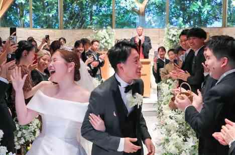 ゲストとの距離感が近い挙式会場。 すぐ近くから、これまで支えてくれた大切な方々からの「おめでとう」の声。「ありがとう」とすぐ返せる距離感だからこそ、コミュニケーションが生まれ、より素敵な時間になります。また、一体感を感じ、自然と涙や笑顔があふれるシーンが見られます。特に挙式退場時に、ご新婦様には敢えてブーケを持たずに歩いていただき、ゲストと触れ合える時間を取っていただきました。