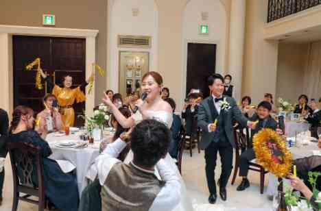 お二人はマツケンサンバの曲で踊り歌いながら、ご入場されました。新郎新婦のことが大好きなゲストの皆様にも、新郎新婦それぞれの写真が貼ってあるうちわや、ペンライトを持って振っていただきました。アイテムを持っていただき、入場も皆様に参加していただくことで、お二人らしく明るく盛り上がる披露宴のはじまりになりました。