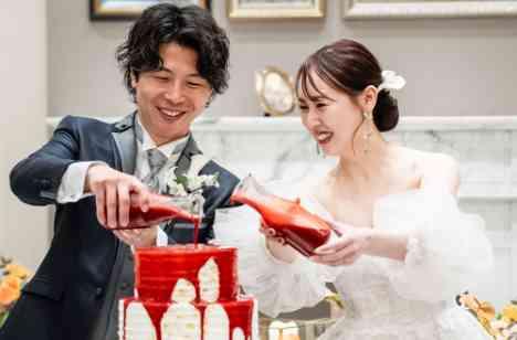 金箔がついているオシャレなウエディングケーキをお選び頂いておりました。 おふたりはゲストを大事にされていらっしゃったのでケーキ入刀だけではなく、ひと手間加えるケーキドリップを行う形式にされました。 おふたりも一緒に作るケーキの特別感やゲストもワクワクされてカメラ撮影をされていらっしゃり、一体感のある時間でした。