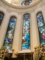 ステンドグラスはアーチ状になっているから、祭壇の二人は光に包まれ、まるで天然のスポットライトの様。 ゲストにも、一度見たら忘れられない光景に。