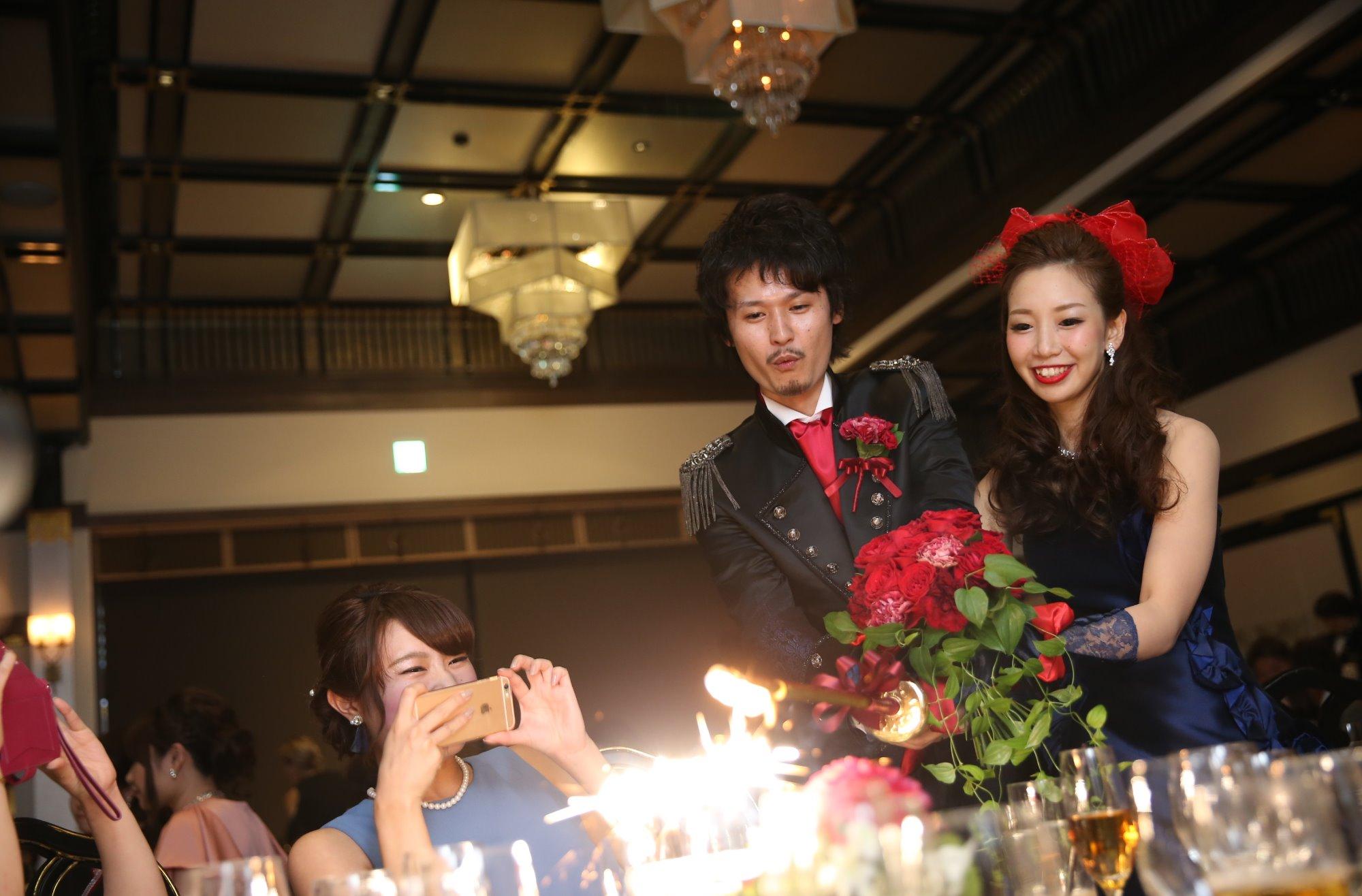 お色直しでタキシードとカラードレスへ♪カラードレスはジブリのキキをイメージして、ネイビーのドレスに赤いヘッドアクセ!!再入場演出では花火型のキャンドルサービスで、ゲストへ驚きと感動を!