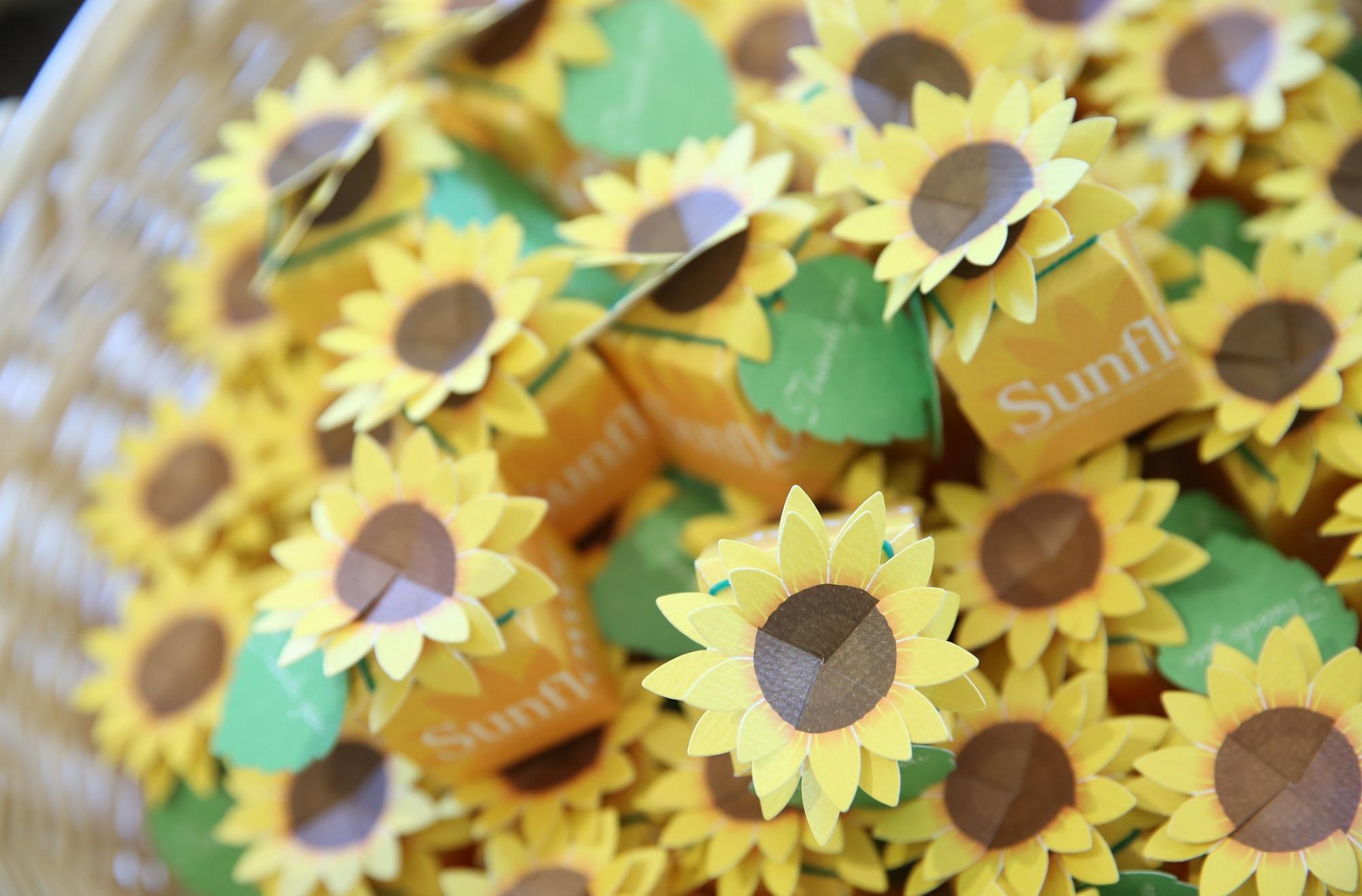 お二人の大好きなひまわりがテーマ☆お二人のお衣裳や会場装花、ウェルカムグッズ、小物等、全部大好きなものに囲まれての素敵なお式!お二人の大好きなものでゲスト様をお出迎えします!