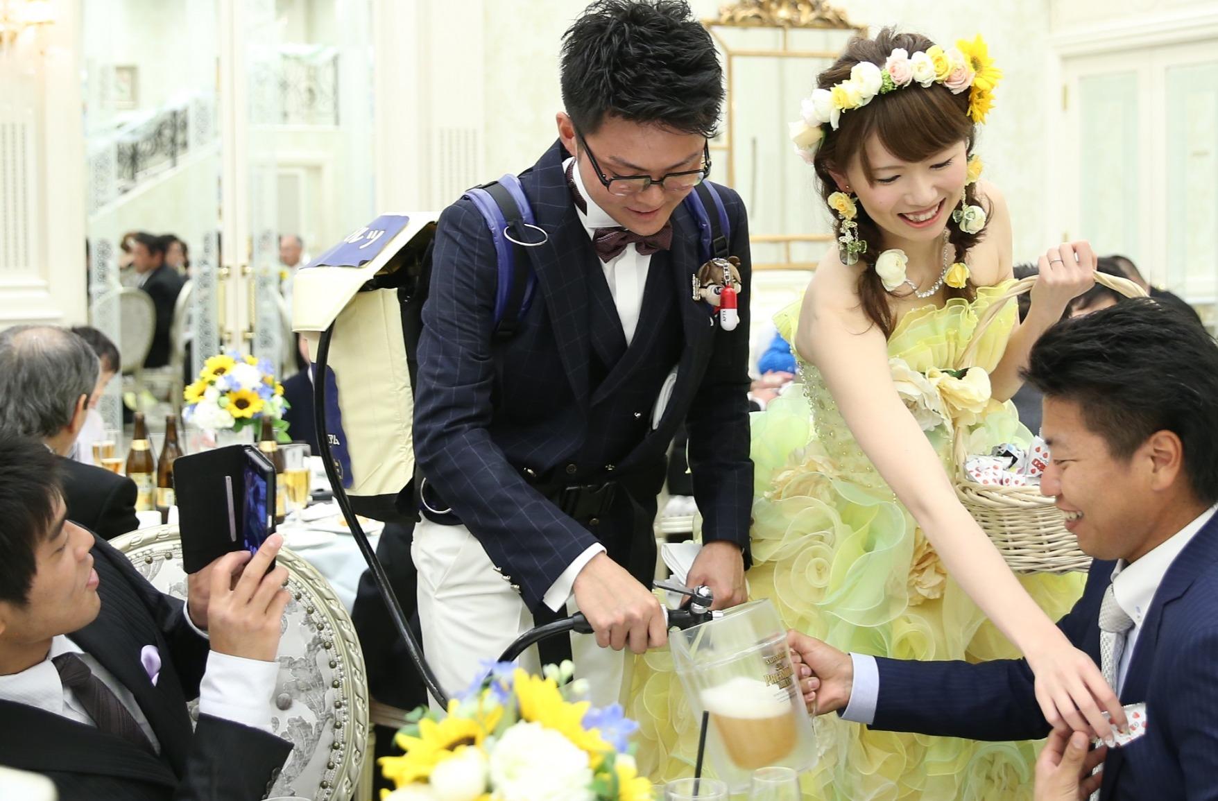 お酒好きなゲストが多いとのことで、おふたりが選んだ演出は「ビアサービス」新郎様は15キロのビア樽を背負って頂き新婦様はおつまみを配りました☆ 全てテーブルをまわり、ゲストの皆様と和気藹々とされてる姿が印象的でした!