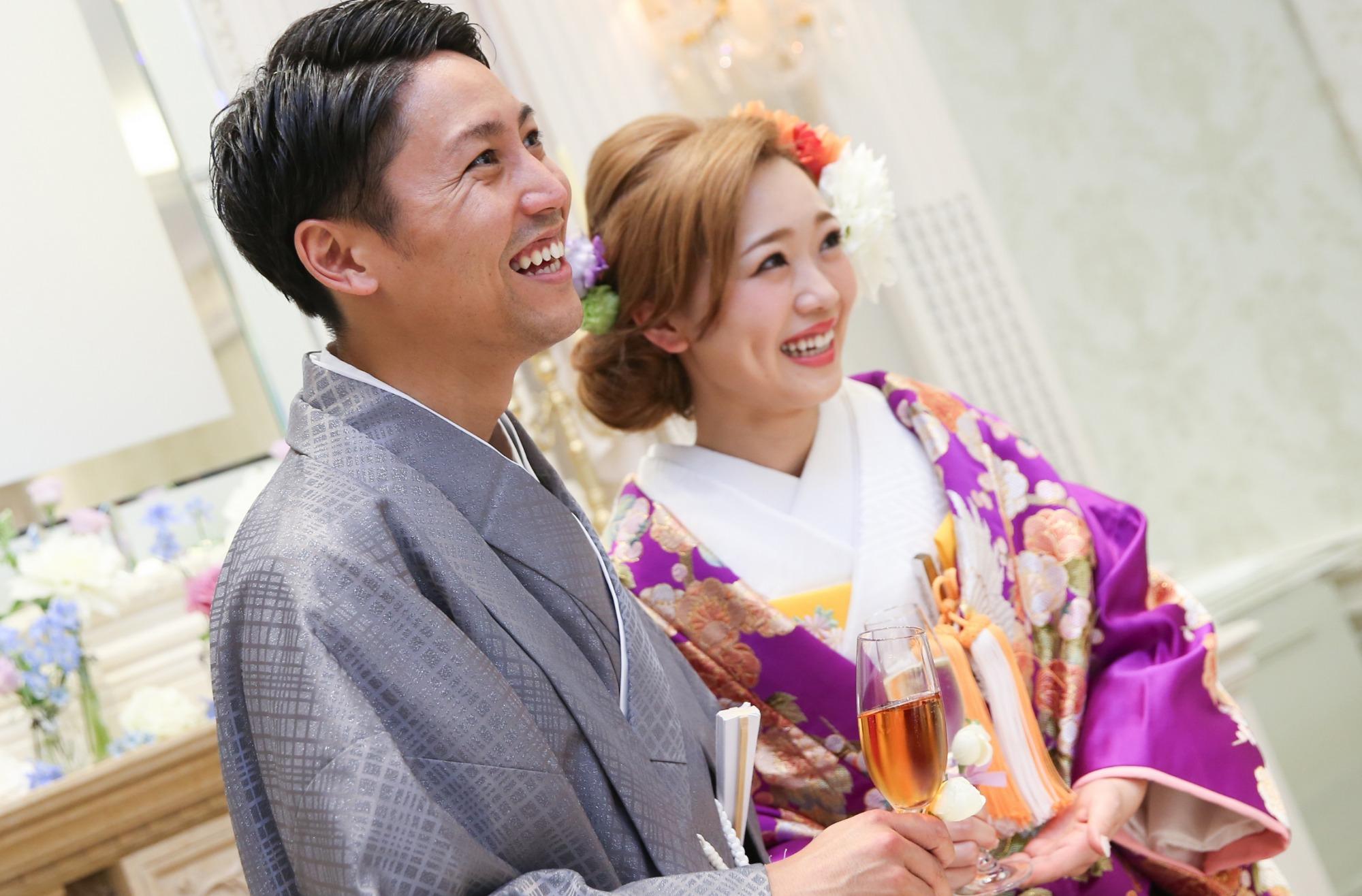 ご披露宴は、華やかな和装でご入場♪和と洋が融合された百花籠だからこそ、洋館のようなお部屋にも、和装がとっても似合います。「乾杯のお写真をお撮りします。」とカメラマンから一言。お二人の目線の先には、カメラマンだけではなくゲストの皆様のカメラもたくさん集まっています!