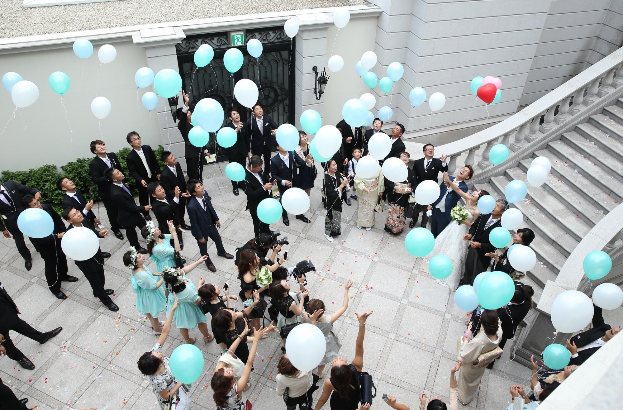 サマーシーズンの挙式だからこそ!!空がとてもきれいな季節に空を貸切で楽しめるバルーンリリースの演出。バルーンカラーは夏らしく!!カラーにもこだわりのテイストを組み込み、ゲストの皆様に喜んでいただけました!新郎新婦様のバルーンだけは可愛くハートでご用意です♪
